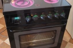 Sporák se sklokeramickou deskou PRIVILEG, šíře 60 cm, hnědý Multifunkční horkovzdušná trouba s kruhovou spirálou u ventilátoru + klasické pečení + gril (4-spirálová trouba). HI-LIGHT plotny s rychlým ohřevem. Displej k programování pečení + hodiny + minutovník. Modře podsvícené spínače. Termostatické spínače ploten. 4 červené kontrolky zbytkového tepla ploten. 2 zvětšovatelné plotny do tvaru kruhu a oválu podle velikosti hrnce. Připojení na 220 V nebo 380 V (230 V /400 V). Plech + mřížka vyjiždí z trouby na lyžinách. Plně funkční. Předvedu.