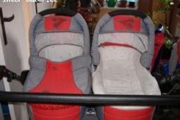 Prodám červeno-šedý kočárek pro dvojčátka. Kočárek obsahuje: dvě hluboké korbičky, používané 5 měsíců, jako nové. Dále dvě sportovní korbičky, používané 1 rok. V rámci reklamace vyměněný úplně nový podvozek. Rozměry kočárku: délka 102 cm x výška 115 cm x šířka 92 cm. Součástí kočárku jsou dvě brašny, síťky proti hmyzu, univerzální pláštěnky na hlubokou i sportovní korbu, prostorný nákupní košík.